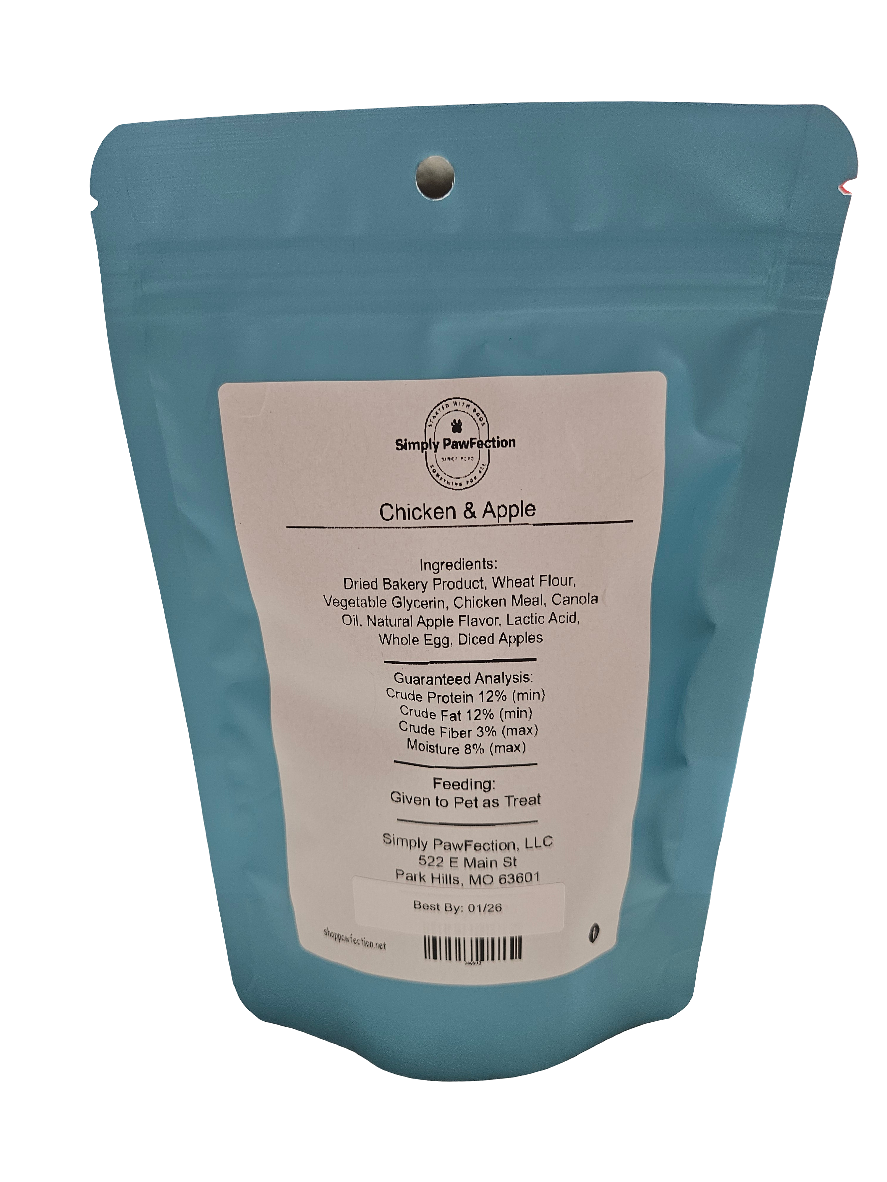 Ingredients: Dried Bakery Product, Wheat Flour, Vegetable Glycerin, Chicken Meal, Canola Oil, Natural Apple Flavor, Lactic Acid, Whole Egg, Diced Apples, Mixed Tocopherols.